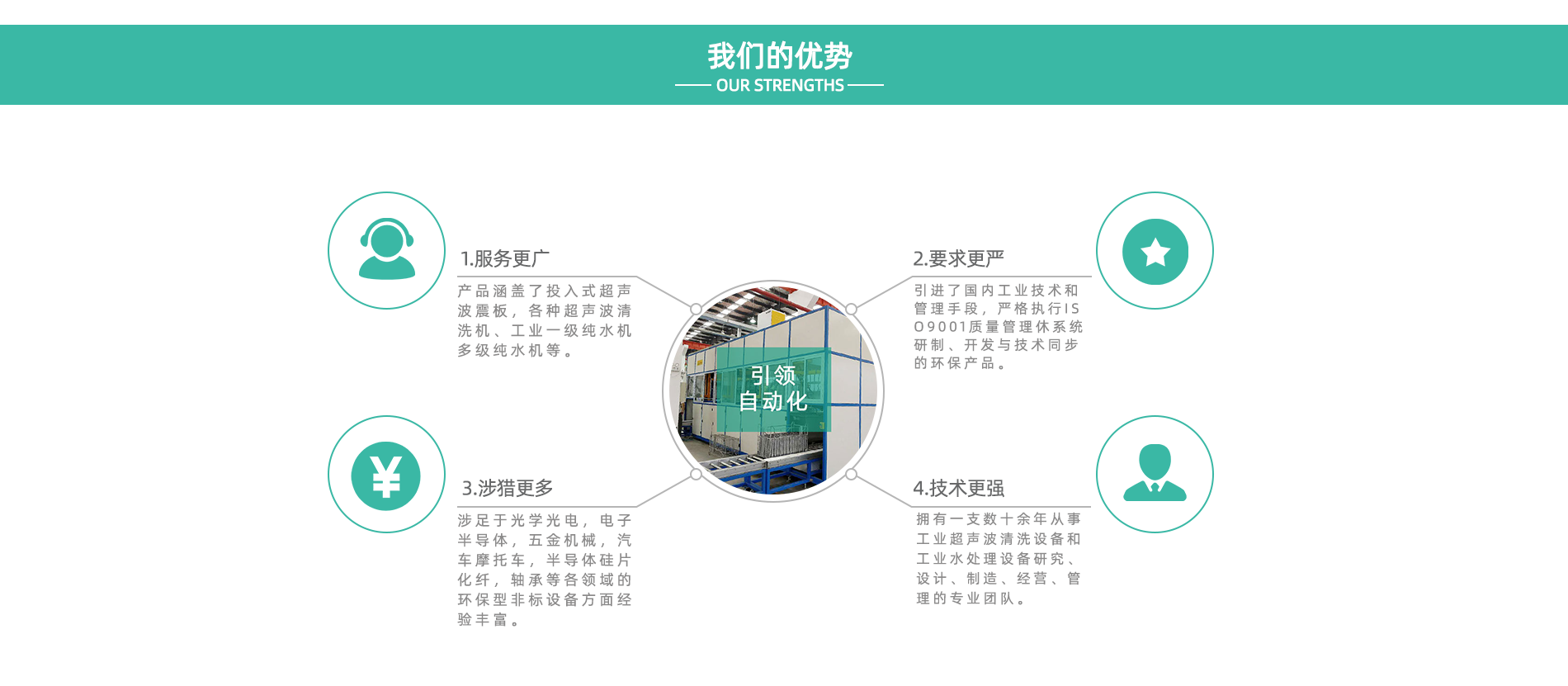 天津市引領自動化科技有限公司是由一支擁有數十余年工業超聲波清洗設備和工業水處理設備研究、設計、制造、經營、管理、銷售、服務于一體的企業。 公司匯集了一批長期致力于工業清洗設備和工業水處理設備研發、設計、制造的人才,引進了國內外的工藝技術和管理手段,嚴格執行ISO9001質量管理體系,研制、開發與技術同步的環保產品。選用日本、美國等原材料、元器件,以設備、熱忱的服務、合理的價格為廣大用戶提供質量穩定、外形美觀的十多個系列、百余個規格的超聲波清洗設備、高壓噴淋清洗設備、工業水處理設備。產品涵蓋了投入式超聲波震板,單槽式超聲波清洗機、多槽式超聲波清洗機、氣相型清洗機、自動型超聲波清洗機、碳氫類超聲波清洗機,高低壓噴淋清洗機等以及工業冷水機,工業一級純水機多級純水機等。 產品具備完善的售前,售中,售后服務制度。尤其在開發設計光學光電,電子半導體,五金機械,汽車摩托車,電池,半導體硅片,化纖,軸承等各領...